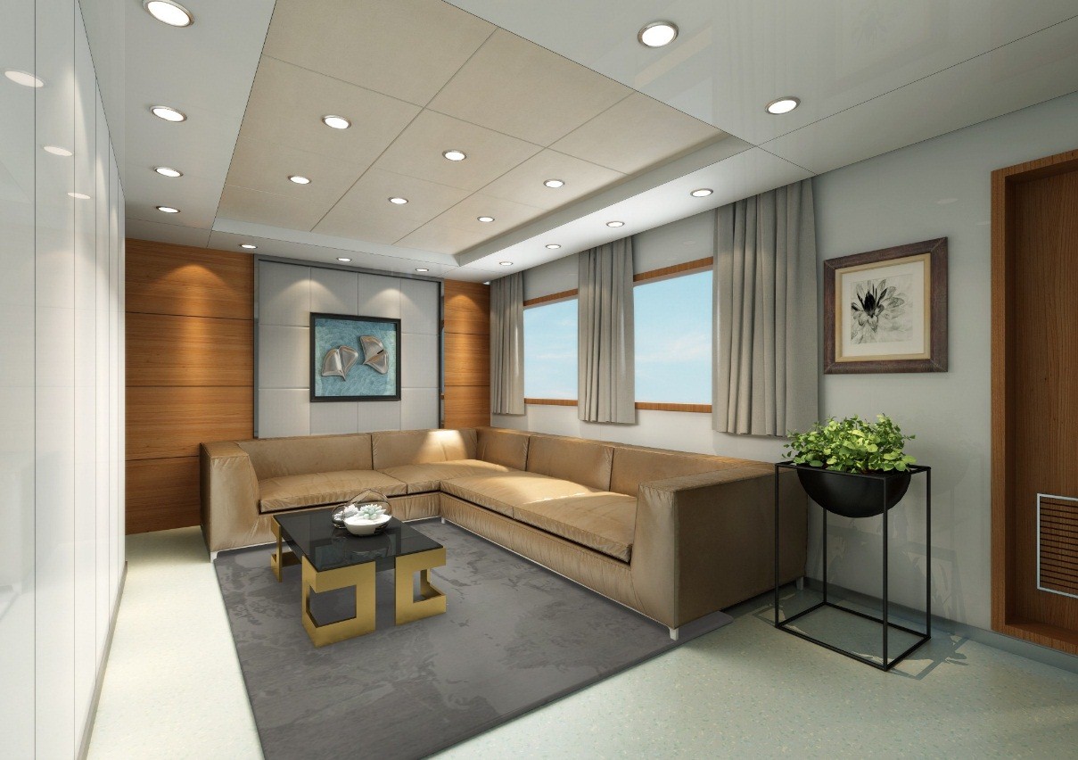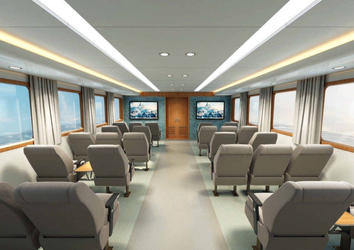 该船设计外观造型美观、新颖、流畅,体现公务执法威仪的特征和强烈的时代感;在提高抗风能力时兼顾舒适性;操纵性好,机动性强,兴波阻力小;船体结构科学合理,振动、噪声小;主要设备选型合理、先进可靠;为减小横摇,本船在主船体左右舷对称设置一对减摇鳍;必要的地方敷设阻尼减振降噪材料,降低振动和噪音;总体布局合理,舱室布置充分考虑人机工程,宽敞明亮、安静舒适、环保;
