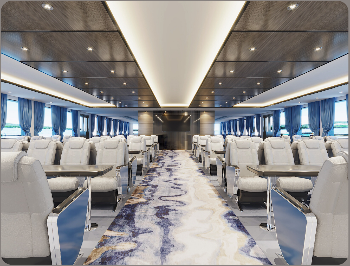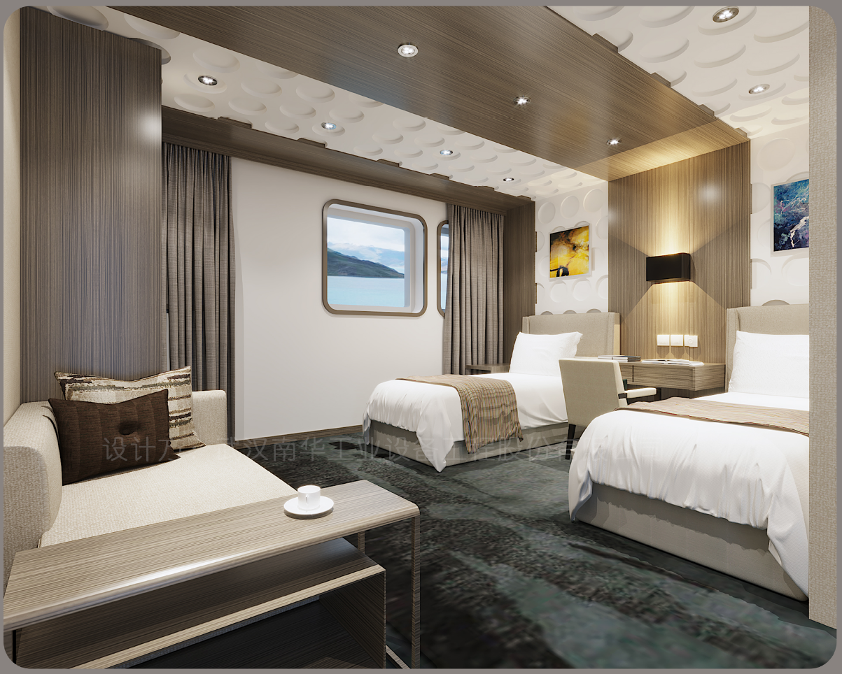 武汉理工船舶股份有限公司自项目承接以来,一直秉承将该船打造成具有舒适、适用、节能、环保的经典船型的目标进行设计研发,该船除正常配备乘客坐席舱室外,还设有咖啡屋、餐饮厅、小型超市、观景卧铺客房等设施。在传统船型基础上融入了更多乘客服务功能和人性化元素,本船外型设计和舱室设计全面对标小型豪华邮轮,投入使用后将全面提升嵊泗地区旅游服务水平。