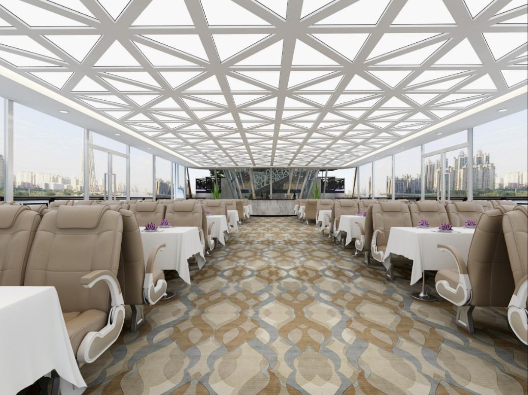 7、顶层游步甲板设置了露天VIP观景区和VIP贵宾休闲、娱乐多功能体验区,是嘉宾接待、洽谈的理想选择。开敞式的天幕顶棚设计,带给乘客360°的观景体验