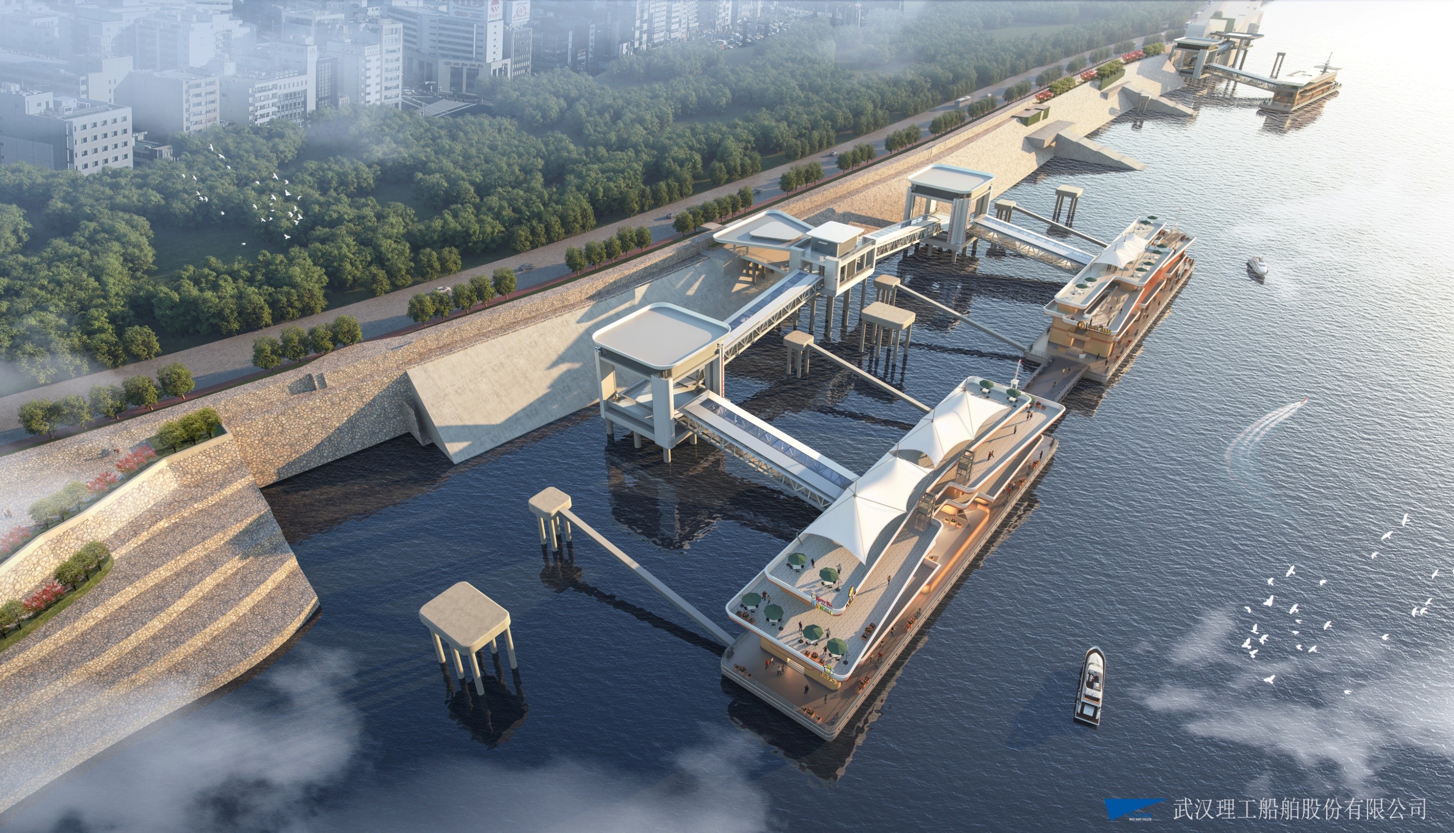 由于三艘趸船处于武汉黄金水道区域,重点打造“水上集市”,满足游客亲水休闲的需求,成为新时代“城市客厅”,促进水岸联动消费场景化,与武汉两岸灯光秀要互为呼应,融为一体,趸船外观设计上必须和周边建筑物协调,采用“现代风”风格。