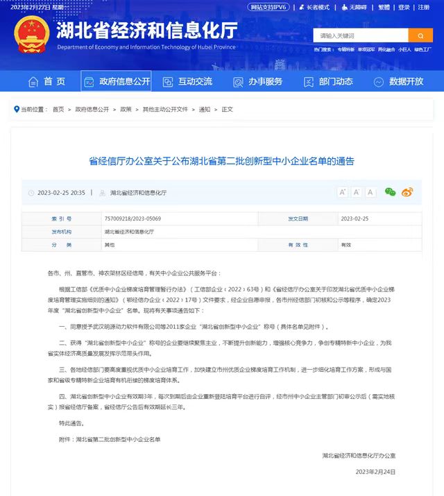 根据工信部《优质中小企业梯度培育管理暂行办法》(工信部企业﹝2022﹞63号)和《省经信厅办公室关于印发湖北省优质中小企业梯度培育管理实施细则的通知》(鄂经信办企业﹝2022﹞17号)文件要求。在经过各市州经信部门的审核和公示等程序,湖北省经济和信息化厅发布了“湖北省创新型中小企业”名单,我公司顺利通过审核,被授予“湖北省创新型中小企业”的称号。