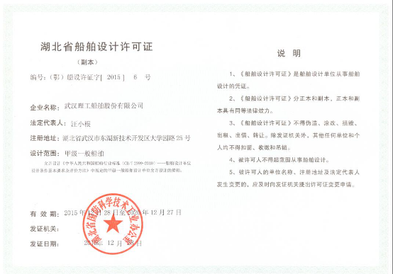In 23rd, December, 2015, WUT Ship CO., LTD, as a national grade a general ship design unit, which was approved by the Hubei Provincial Office of national defense science and industry organizations. Under its on-site evaluation and acceptance, finally, we passed the qualification assessment with success, and acquired the qualification certificate.
