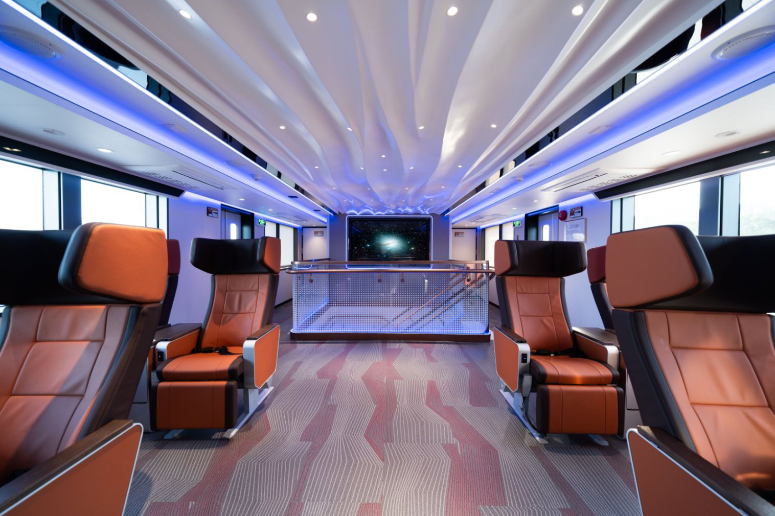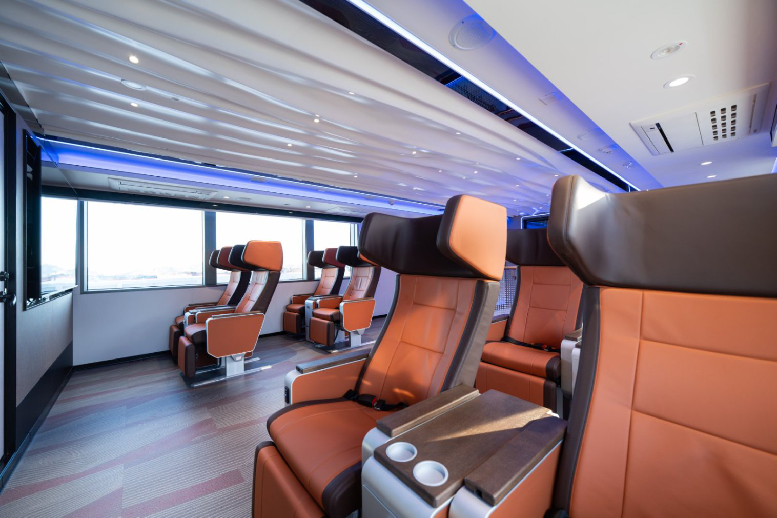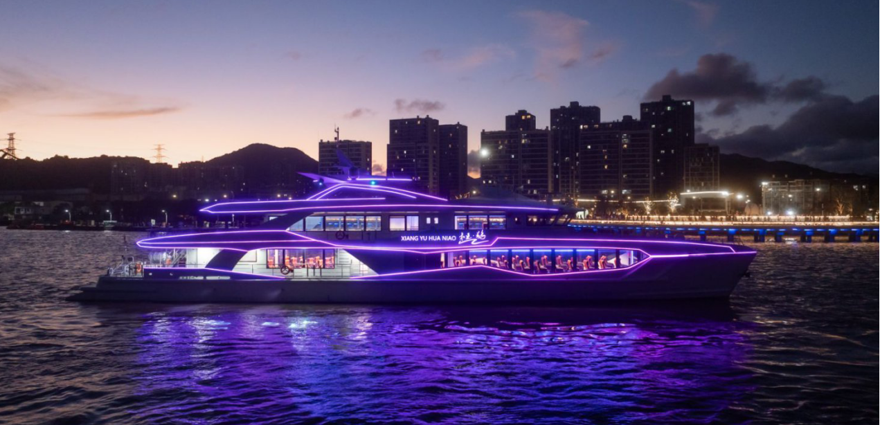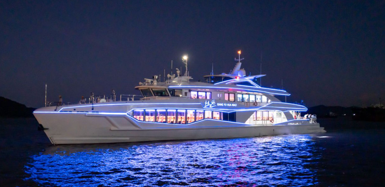 宽敞通透的客舱布局、人性化的座椅设计和全景舷窗,让乘客在享受高效通勤的同时,也能饱览东海碧波与星罗棋布的海岛自然风光。此外,船上还配备多功能室、娱乐甲板等活动空间,除满足日常的海上休闲娱乐、游览观光需求外,还可提供婚庆等特色服务,充分满足来花鸟观光旅游群体的多方面需求。